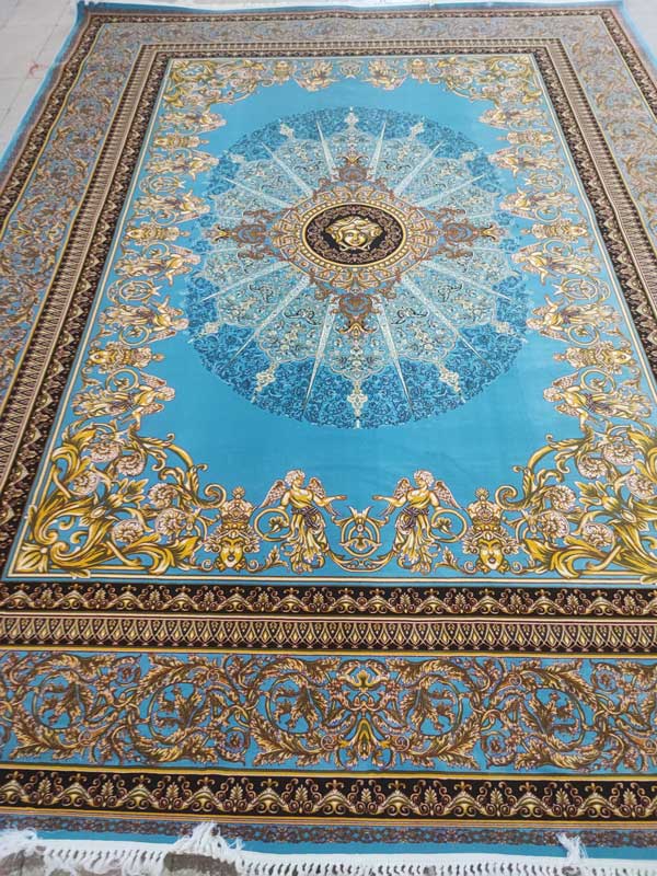 فروش مستقیم فرش 1200 شانه طرح ورساچه با زمینه آبی فیروزهای از کارخانه کاشان | فرشی لوکس با بافت ریز، طراحی شکیل، دوام بالا و کیفیت صادراتی.