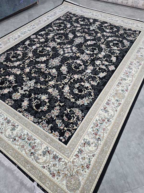 فرش ۱۲۰۰ شانه گل برجسته طرح آذین سرمهای | سبک افشان، مقاوم، بدون پرزدهی و خرید مستقیم از کارخانه با قیمت مناسب.