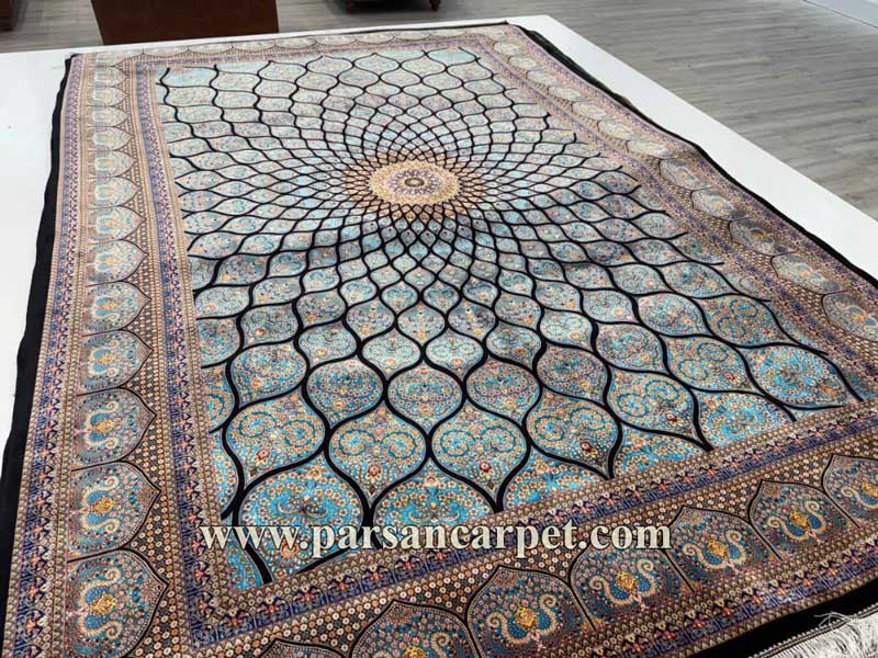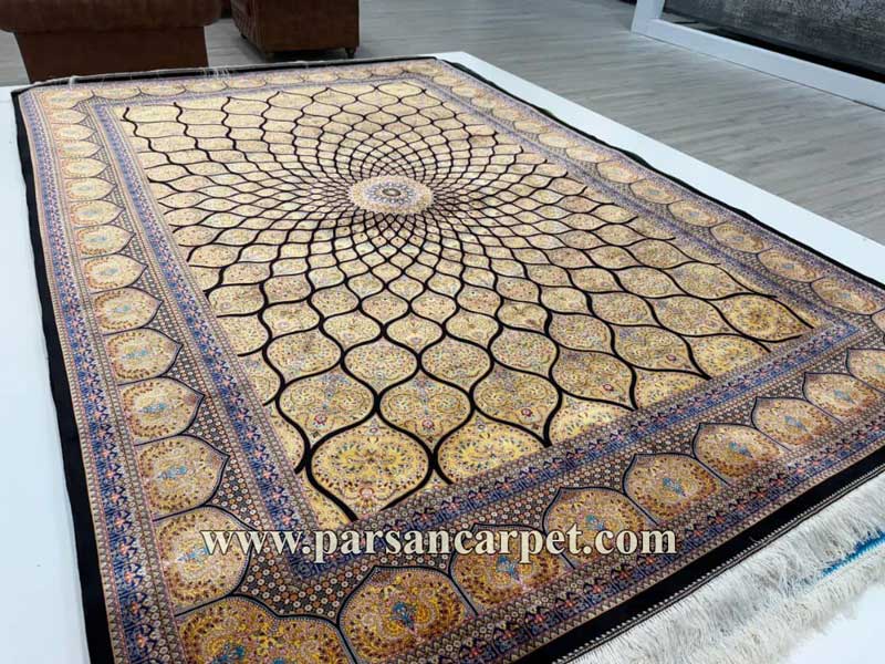 خرید فرش ماشینی لاکچری با طرح گنبدی و تراکم 1500 شانه، با نخ ویسکوز درخشان. مخصوص صادرات و خانههای لوکس با طراحی خاص.