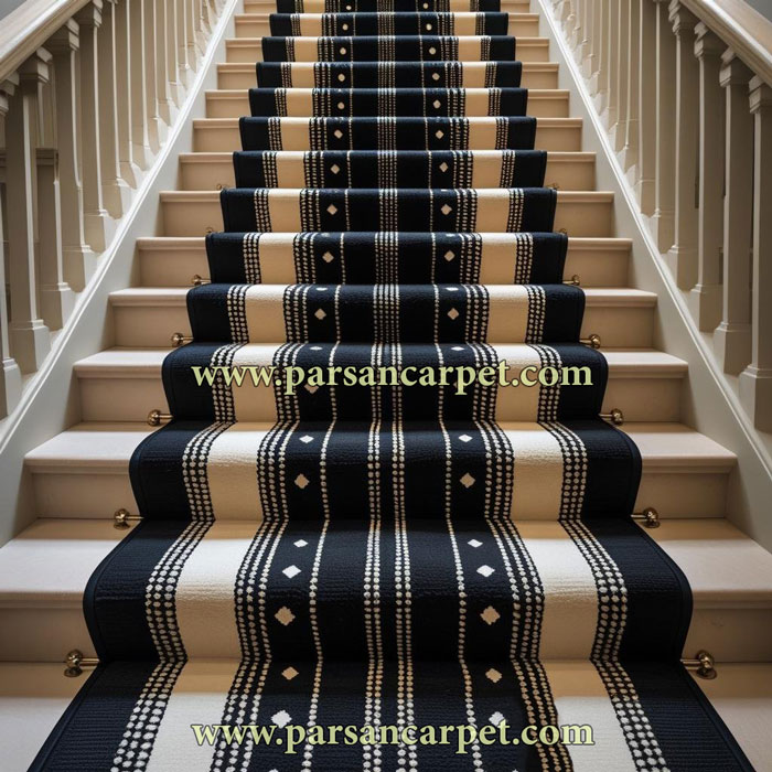خرید فرش استقبال و فرش تشریفاتی راه پله هتلی با رنگ کرم سرمهای، در مدلهای 440، 500 و 700 شانه. تولید طبق سفارش با قیمت مناسب از کارخانه پرسان پارس کاشان.