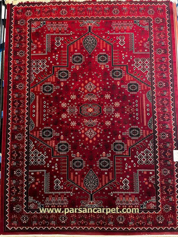 قیمت فرش 700 شانه لاکی طرح قشقایی با نخ اکریلیک 100٪، طراحی سنتی اصیل ایرانی، پاخور نرم و دوام بالا. خرید مستقیم فرش ماشینی سنتی از کارخانه فرش کاشان با ارسال سریع.