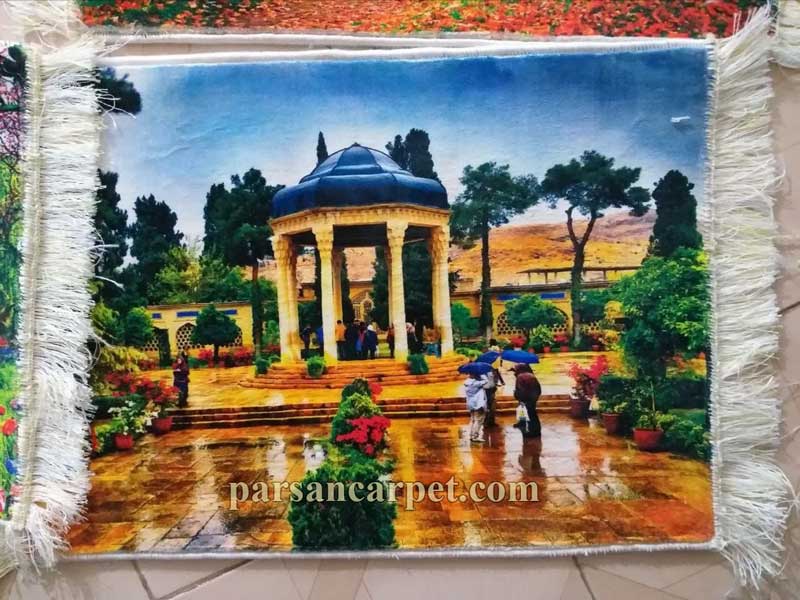 تابلو فرش چاپی 1200 شانه ایرانی با طرح زیبای حافظیه شبراز دارای بافت ظریف و دقیق، رنگهای زنده و کیفیت بالا، این تابلو فرش، زیبایی و اصالت هنر ایرانی را به فضای شما میآورد.